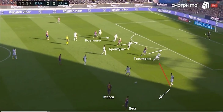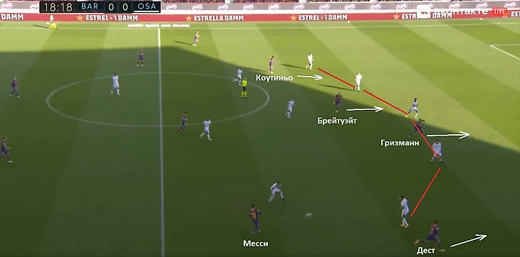 При получении мяча на правом фланге, Месси обычно ждал подключение Деста вперед. Таким образом, крайний защитник «Барселоны» цеплял за собой своего прямого оппонента по позиции, что открывало коридор еще шире. Позиция Месси на фланге обязывало Коутиньо, Гризманна и Брейтуэйта атаковать через каналы в обороне «Осасуны». Так, у аргентинца было несколько вариантов для передачи, но, как правило, проникающая передача идет на ближнего вбегающего игрока. Двое других делают рывок в штрафную площадь с расчетом на прострел, в том числе и во второй темп.