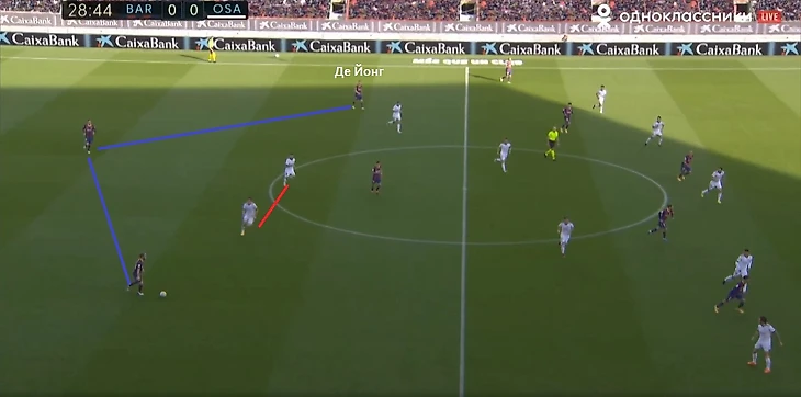 Во-первых, стоит отметить то, что ситуативно «Осасуна» оказывала давление на двух центральных защитников соперника. В таком случае Де Йонг смещался на фланг, и ситуация становилась в пользу обороны «Барсы» 3 в 2.