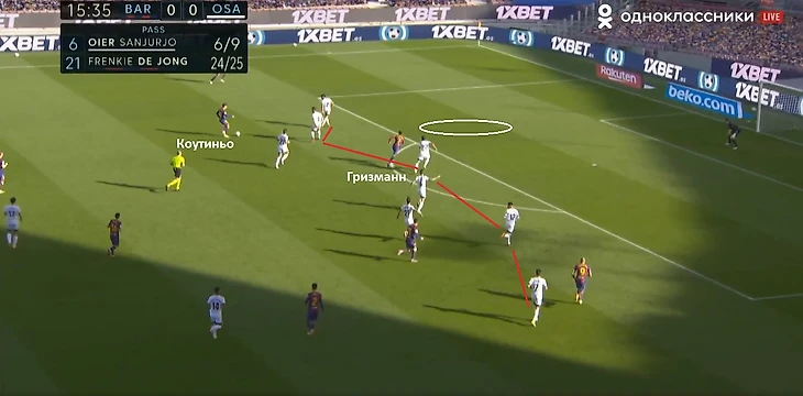 Далее, эпизод уже без участия Лео, однако, показывает насколько хорошо игроки группы атаки «Барселоны» использовали каналы между защитниками. Здесь атака идет через левый фланг, каталонцы ловят соперника в переходной фазе, после потери мяча «Осасуна» не успевает должным образом выстроиться в линии. В результате, Коутиньо дает передачу на вбегающего Гризманна.