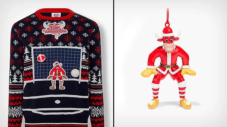«Ред Булл» предлагает быка-голкипера, как в виде игрушки, так и на свитере, к которому в комплекте идут мячи с липучками, которые можно кидать в ворота (что???? да:)
