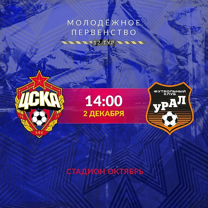 2 декабря на искусственном поле стадиона «Октябрь» (ул. Живописная, 21) состоится матч 12-го тура Молодежного первенства России ПФК ЦСКА — «Урал».