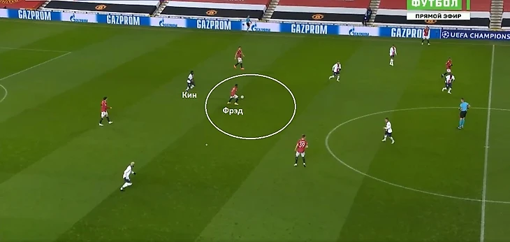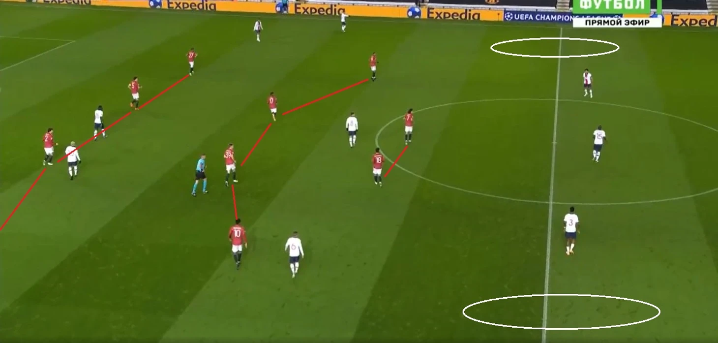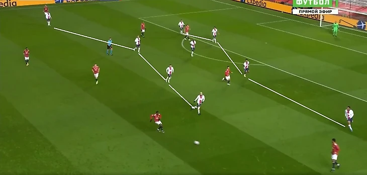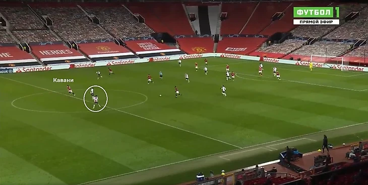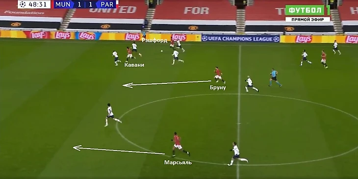2. При продвижении соперника «Манчестер Юнайтед» на своей половине поля перестраивался в оборонительную схему 4-4-2. Эдинсон Кавани и Бруну Фернандеш располагались на одной линии. При отборе мяча у «ПСЖ» игроки «МЮ» направляли мяч через фланг, который оставался открытым из-за высокого расположения крайних защитников французского клуба. Эти зоны на краях атаковали, соответственно, Рэшфорд и Марсьяль. Кавани и Фернандеш забегали в коридоры между центральными защитниками.