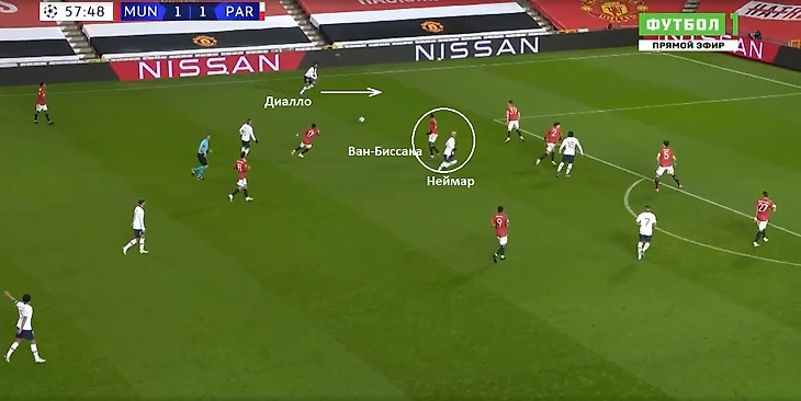 Эпизодически «красные» выстраивались в позиционную атаку. Однако команда не так хороша в этом аспекте. Игрокам не удавалось расшатать оборону соперника, для создания пространств между линий, или коридоров для проникающих передач. Таким образом, эпизоды заканчивались навесами в штрафную площадь «ПСЖ». Причем в основном они шли с левого фланга атаки «МЮ». У крайнего защитника Алекса Теллеса за всю игру насчитывается восемь навесов. Для сравнения, у Ван-Биссаки ни одного навеса за матч.