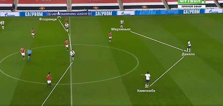 «ПСЖ» в развитии собственных атак преимущественно использовали фланги – 41% левый, 35% правый. Крайние защитники занимали свои позиции высоко, заполняя открытые зоны, которые им создавали своими смещениями в полуфланг Неймар и Мбаппе. То есть Ван-Биссака и Алекс Теллес переключали свое внимание на движения своих оппонентов, тем самым сужались с центральными защитниками. Так фулбеки «ПСЖ» получали небольшое пространство и время для принятия передачи и дальнейшего заброса в штрафную площадь.