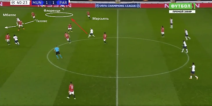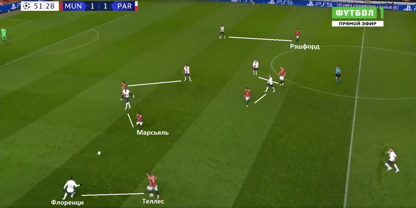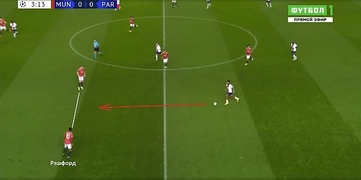 Рэшфорд и Марсьяль не могли постоянно опускаться так низко во фланг, чтобы прикрывать крайних защитников соперника. Если смещаться ниже, то перед центральным защитником «ПСЖ» создается много пространства для движения вперед, плюс коридор в полуфланг для передачи.