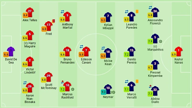 У «ПСЖ» был схожий прессинг. Игроки не давили на соперника, располагаясь преимущественно в средней трети поля. Единственным игроком на острие атаки оставался Мойзе Кин, один против двоих центральных защитников «Манчестер Юнайтед». К тому же в опорной зоне оставалась свобода для передачи на игрока. При продвижении мяча соперником «ПСЖ» на своей половине поля перестраивался в схему 4-1-4-1.