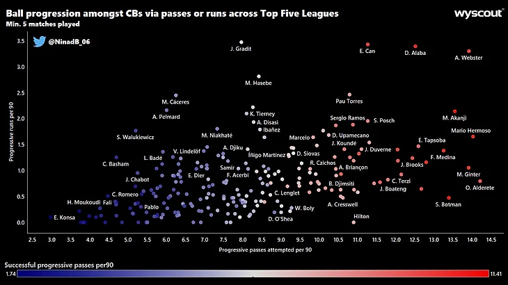 Как показывает данный график, Адам Уэбстер из Брайтона - лучший ЦЗ топ-5 лиг Европы по совокупности данных показателей, но работа в отборе - слабое место в арсенале англичанина.