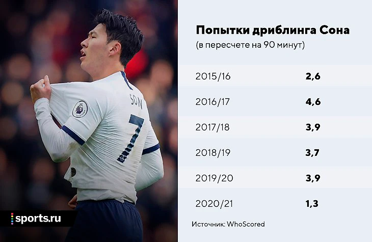 Падение обводок Сона очень характерно. Сейчас у корейца антирекорд за все время в «Тоттенхэме». Но как и с касаниями Кейна в штрафной, это не критика, а результат новой роли.