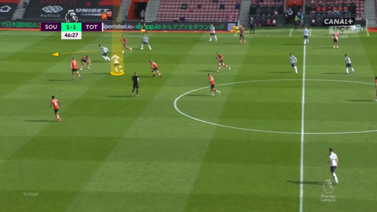 Первый вариант – из матча с «Саутгемптоном». Кейн опустился поглубже, защитники его не поджали. Как следствие, Харри получил свободу с мячом и отправил Сона в прорыв: