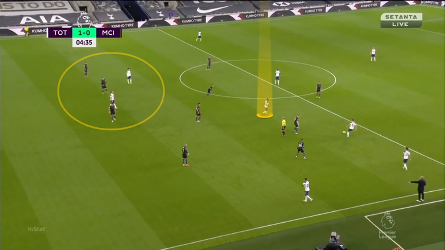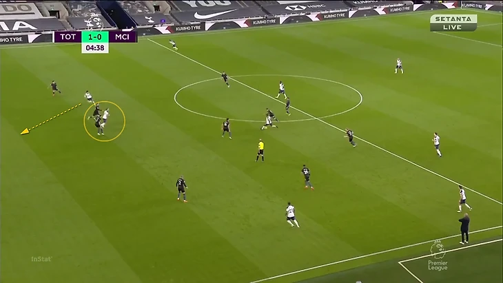 Это – ситуация из игры с «Ман Сити». Тут Кейн остается между защитниками, а Ндомбеле оттягивается назад, чтобы получить передачу: