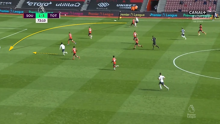 А это пример из матча с «Саутгемптоном» в этом сезоне. Кейн снова оголил зону левого защитника, Сон снова оторвался от правого. Итог – идентичный голевой пас Харри: