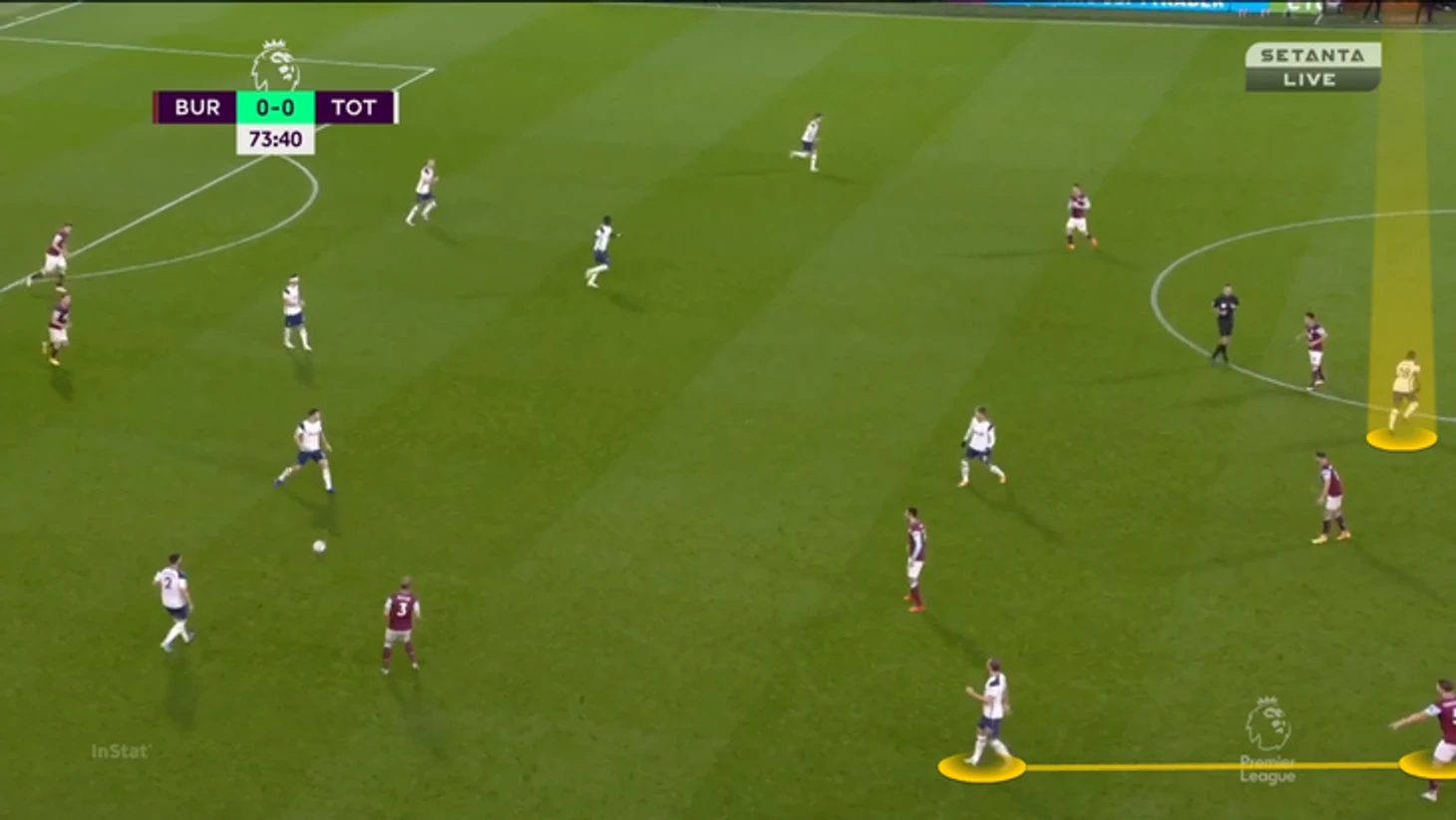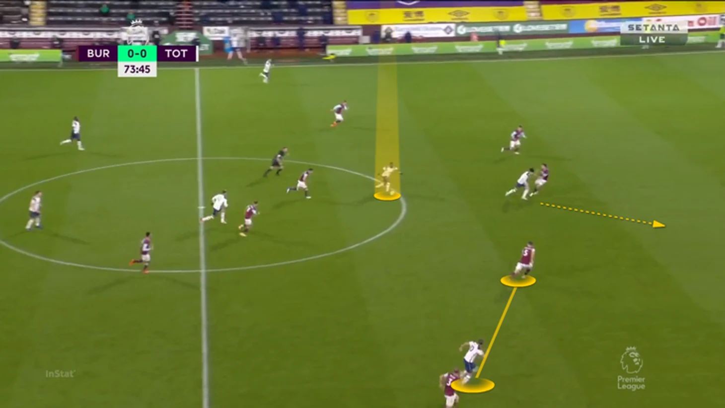 Ниже – эпизод из игры с «Бернли». Тут Кейн открывается на фланге и стягивает центрального защитника Джеймса Тарковски. Ндомбеле читает эпизод и сразу идет открываться между линиями: