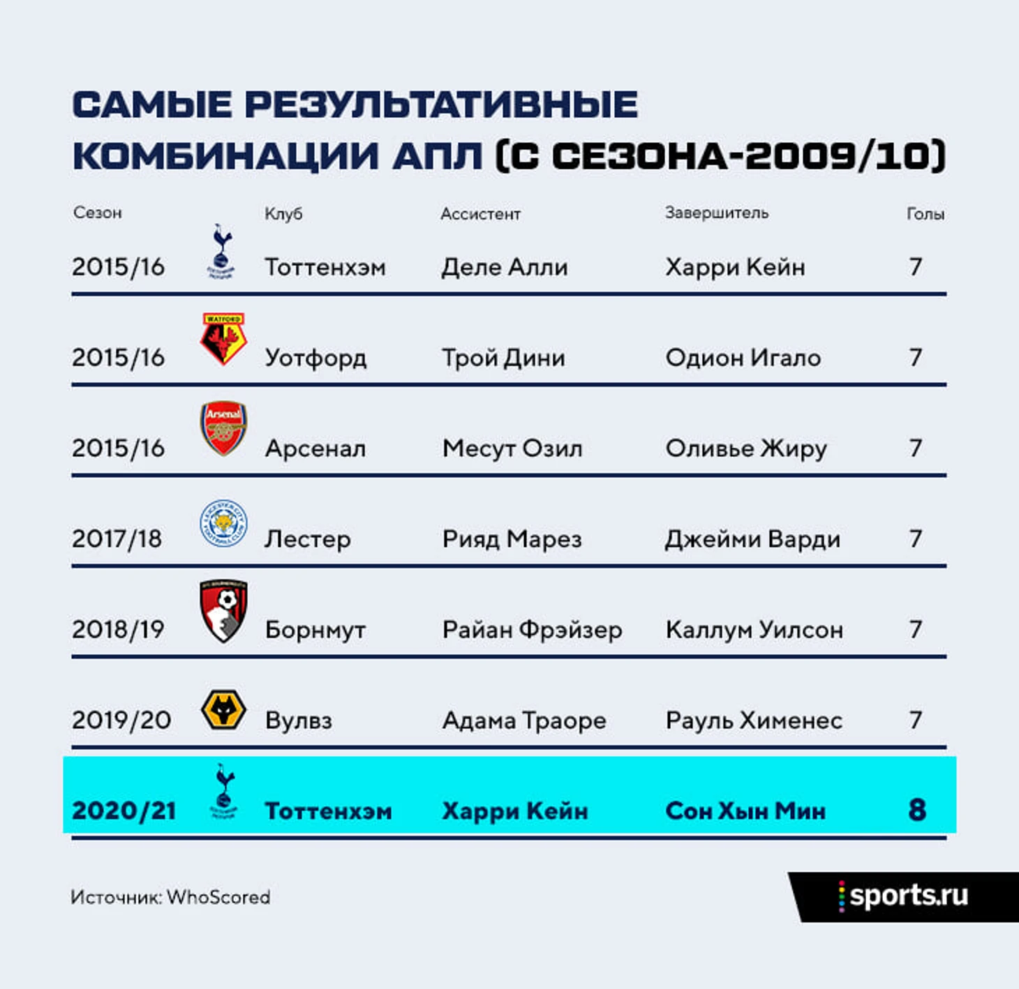 Результативность поражает и в контексте всей истории АПЛ в эпоху статистики. С сезона-2009/10 (момент прихода Opta в футбол) ни одна комбинация до них в Премьер-лиге не сгенерировала больше семи мячей за кампанию – на этой отметке останавливались в шести случаях. Кейн и Сон забили два уже в первом тайме (по разу один отдал ассист другому) и установили рекорд – у них впереди 27 игр, чтобы оторваться еще дальше.