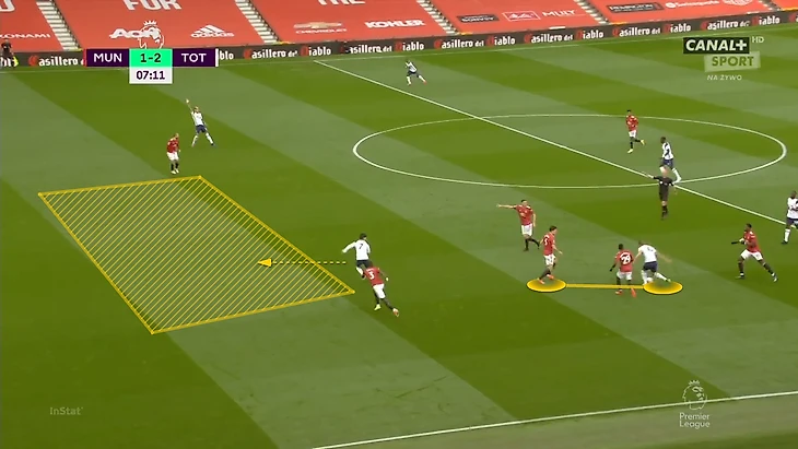 Особенно важен в этом плане Танги Ндомбеле. В этом сезоне француз наконец пробился в планы и состав Моуринью. Его самая частая роль – десятка. По сути Ндомбеле вместе с Кейном разрывает опорную зону соперника. Второй вариант – Танги предлагает вариант между линиями, когда Харри смещается в другую локацию.