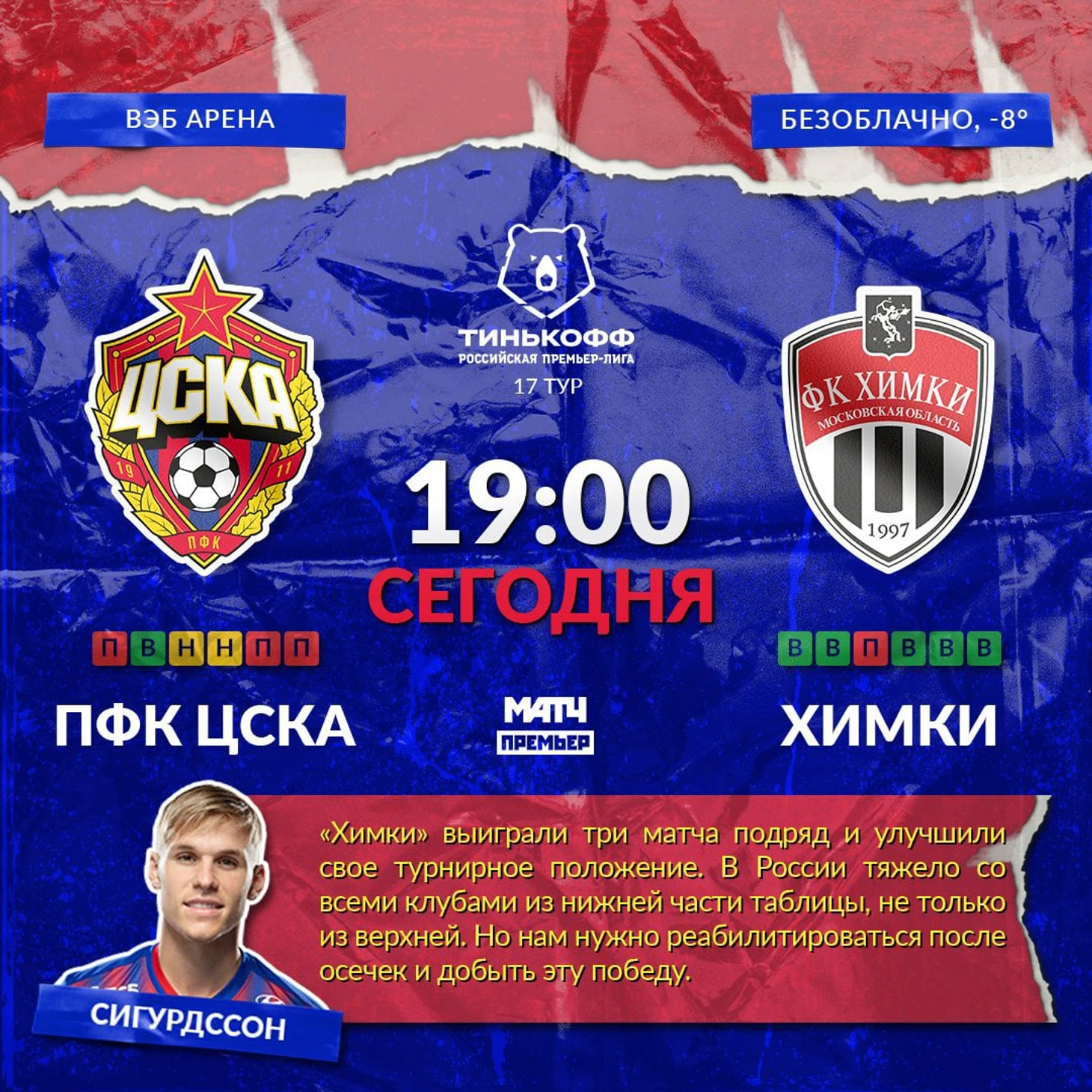 Игра пройдет сегодня в Москве на ВЭБ Арене, начало матча в 19:00 по московскому времени. Конкуренты ЦСКА в борьбе за первую строчку вчера одержали победы в матчах 17-го тура Тинькофф РПЛ. Сейчас ЦСКА занимает третье место в турнирной таблице.