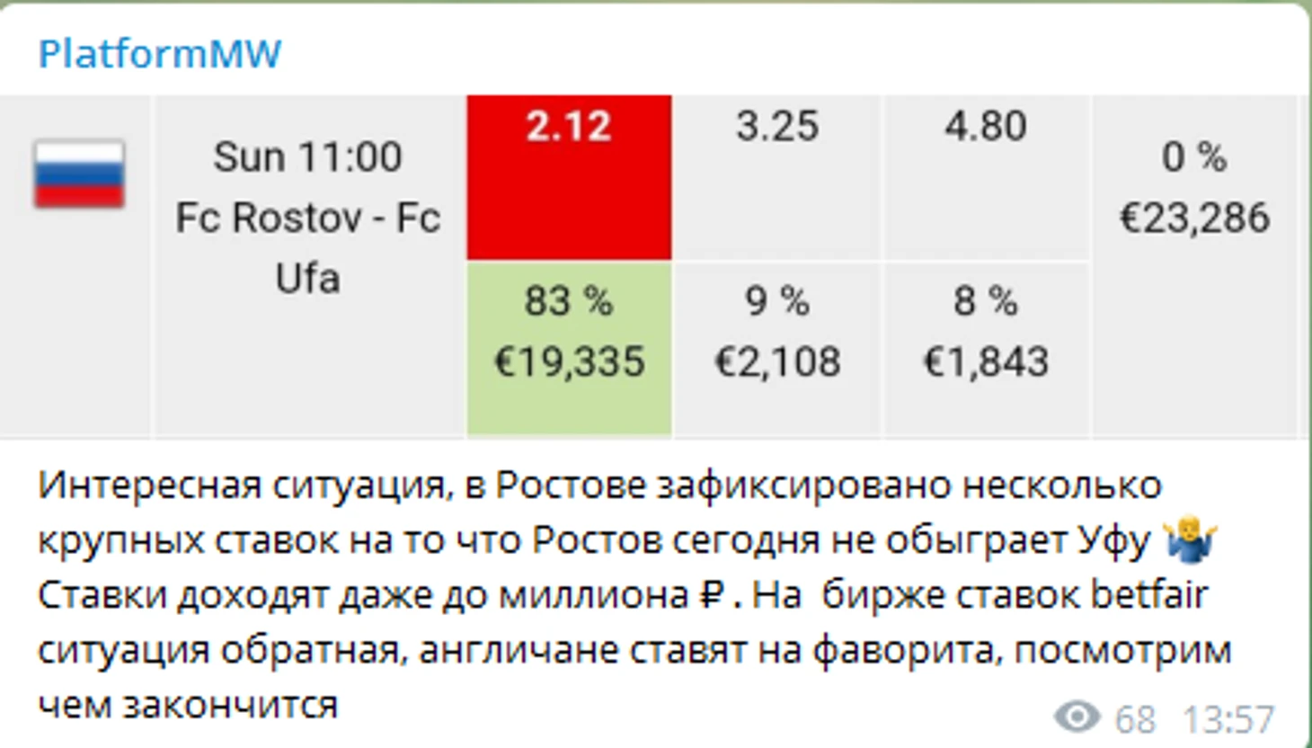 Сегодня в Ростове команда Карпина примет ФК Уфа, на популярном мониторинговом сервисе PMW , который мониторит движение средств в различныых БК , заметили подозрительную активность в букмекерских конторах Ростова. Некоторые игроки поставили крупные сумму денег на то , что Ростов не обыграет Уфу, несмотря на то что является явным фаворитом встречи