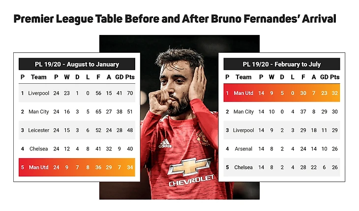 Влияние Бруну Фернандеша невозможно переоценить. «МЮ» был на пятом месте за день до дебюта португальца в Премьер-лиге, отставая от четвертого «Челси» на 6 очков, а закончил третьим (набрали больше поинтов, чем любая другая команда – 32). Сам португалец выдал шикарнейшую результативность: 8 голов и 7 ассистов в 14 поединках.