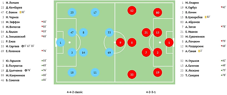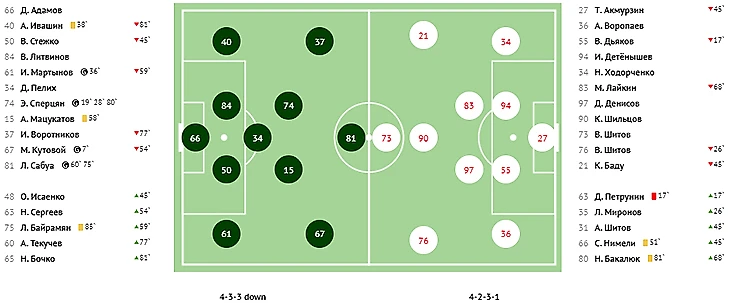 После навеса Владислава Сысуева с корнера, назначенного на левом фланге, Губочкин сделал сброс головой на линию вратарской Алексей Губочкин, а Максим Бачинский, оставшись без прикрытия, нанёс разящий удар.