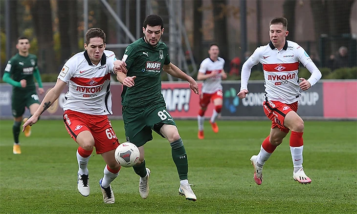 Уже на 7-й минуте Алекс Мацукатов отдал отличный проникающий пас между двумя защитниками «Спартака-2» на Максима Кутового, который вышел на рандеву с голкипером и уверенно его переиграл. Вскоре травму получил столп обороны красно-белых Виталий Дьяков, а вышедший вместо него на замену Даниил Петрунин сотворил «фол последней надежды» и увидел красную карточку. Более того, исполнявший назначенный за это нарушение штрафной Эдуард Сперцян пробил точно в правую «шестерку». 2:0 в пользу хозяев. После чего «Спартак-2» почему-то выбросил белый флаг, а краснодарцы, напротив, лишь наращивали мощь своих атак.