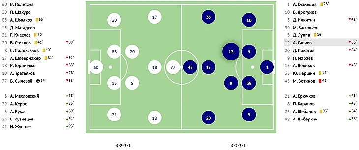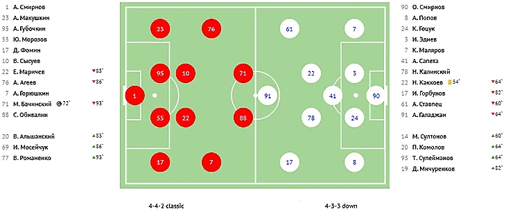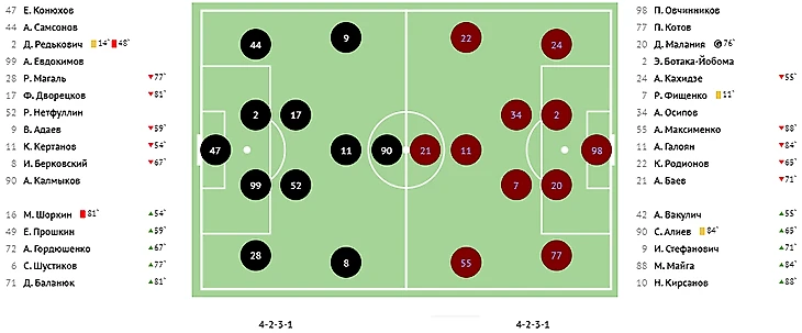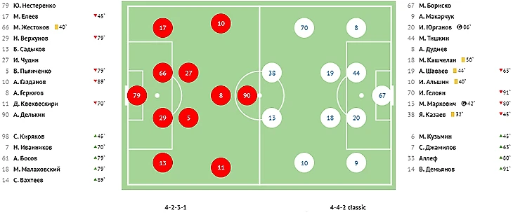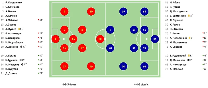 Чёткая передача из глубины в исполнении Ислам Машукова вывела Батраза Гурциева на рандеву с Ильей Абаевым, форвард голову поднял, увидел позицию голкипера и первым же касанием того перекинул. 2:0. А потом уже сам Ислам Машуков выскочил на мяч, прокинул его мимо соперника, вышел на рандеву с Ильей Абаевым и пробил мимо голкипера.
