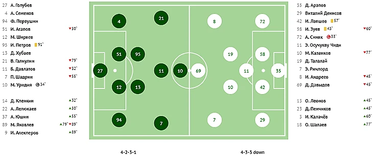 Сначала Мераби Уридия с правого фланга прострелил в штрафную, где Антон Синяк пытался опередить Данила Кленкина и вынес мяч. Однако он попал в Лапшова, рикошетом от которого и залетел за спину Дмитрию Арапову. Вот такой курьезный гол получился.