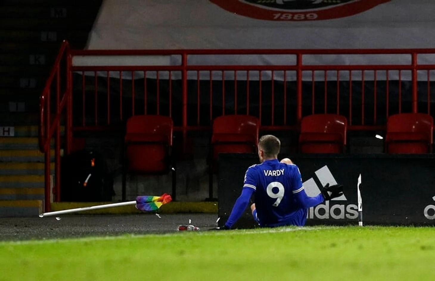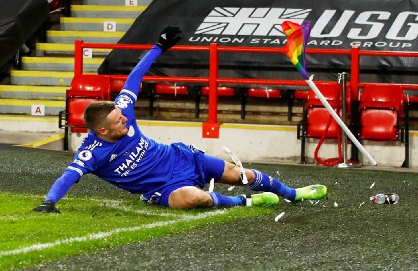 🏳️🌈 Варди снес радужный угловой флажок эпичным подкатом: стойка разлетелась в щепки, он постарался починить, но все равно получил желтую