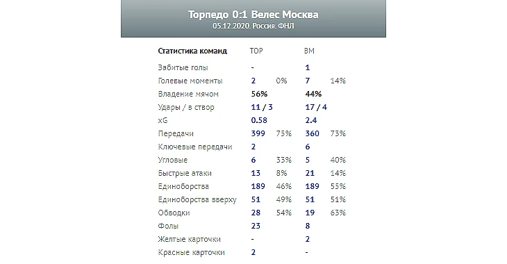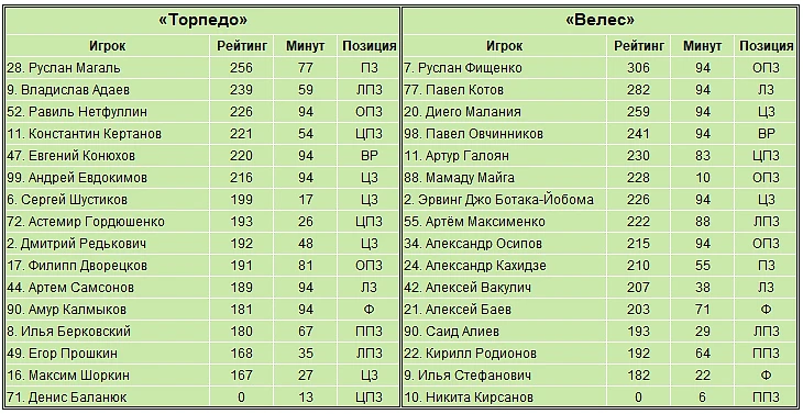 Рейтинг футболистов «Торпедо» и «Велеса» от спортивного аналитического агентства InStat