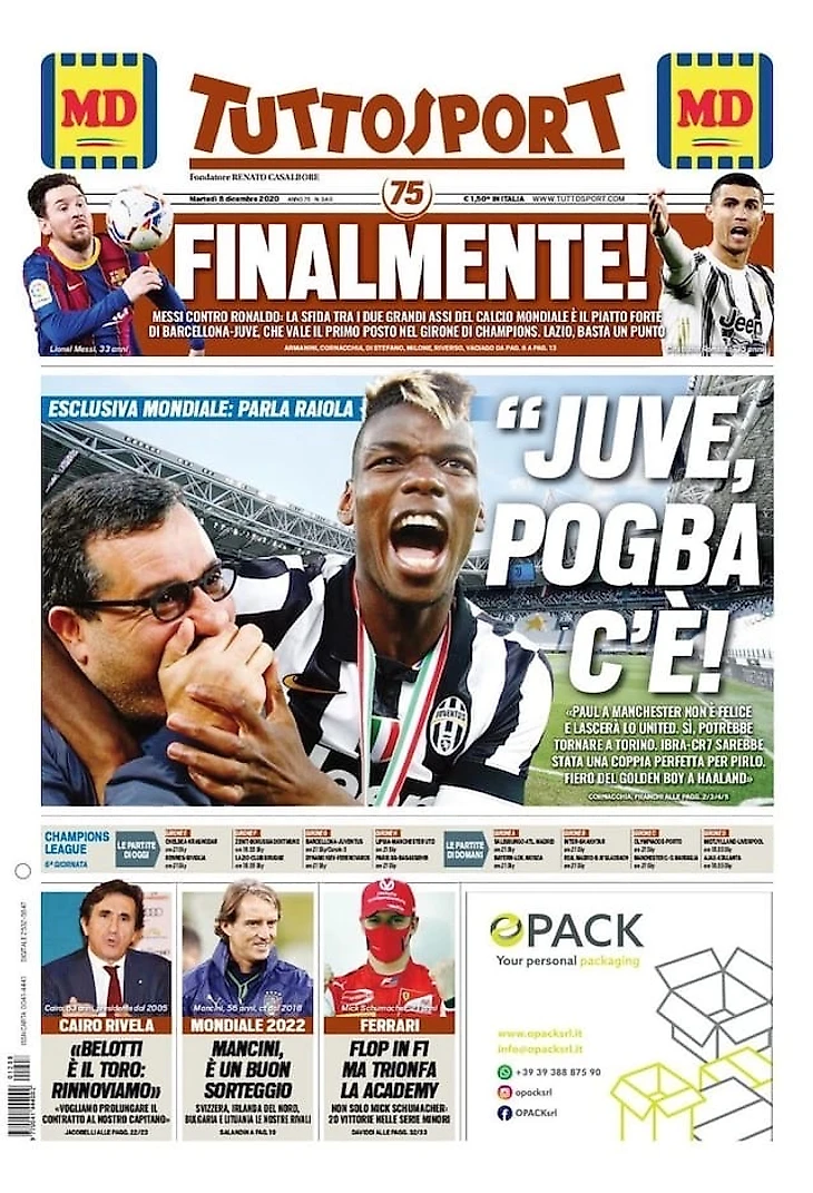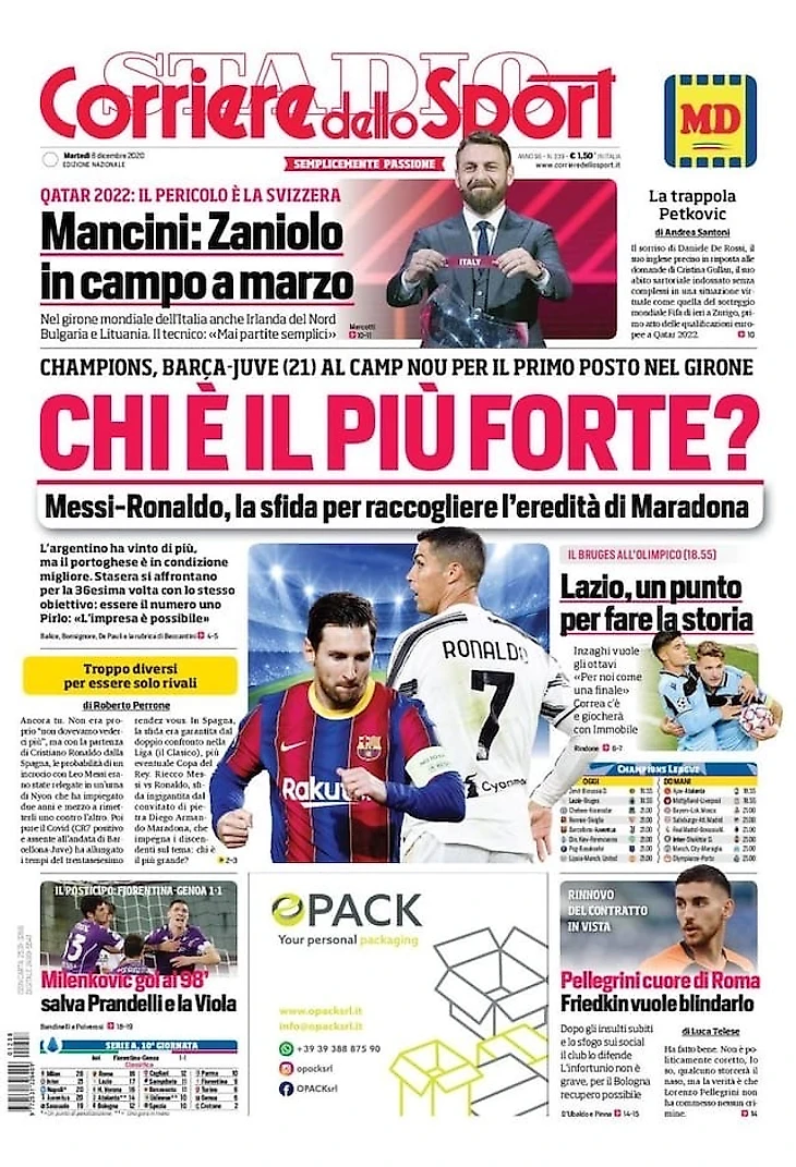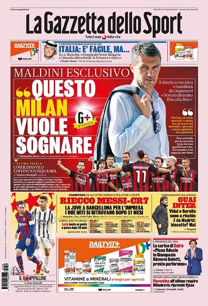 Схватка Роналду с Месси в Лиге Чемпионов, матч «Лацио» с «Брюгге», итоги жеребьёвки квалификации Чемпионата Мира-2022, а также большие интервью Мальдини и Райолы – в утреннем обзоре заголовков итальянских спортивных изданий в блоге «В гостях у Кальчо».