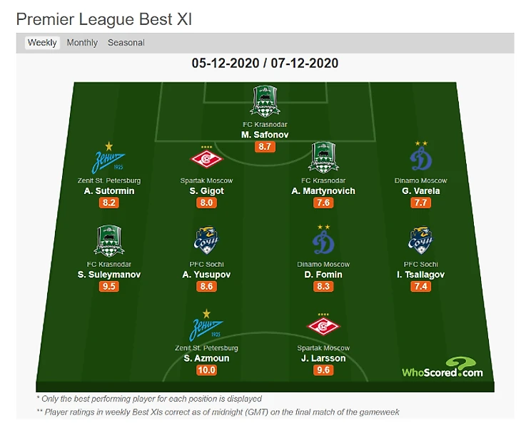 Портал WhoScored представил символическую сборную лучших футболистов 17-го тура Российской Премьер-Лиги.