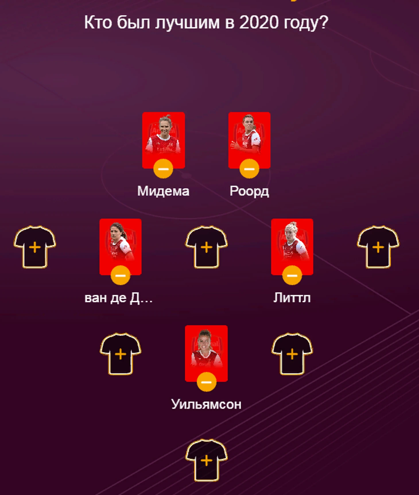 На сайте УЕФА сейчас проходит голосование за команду 2020 года. Можно выбрать как мужскую команду, так и женскую. 5 футболисток из “Арсенал Вумен” попали в список лучших.