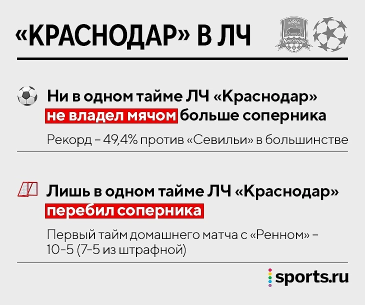 Отчасти из-за потерь в этой Лиге чемпионов точно никто не восхитился стилем «Краснодара». Команда Мусаева – худшая в турнире по владению (41,0%). Показатели «Краснодара», который до сих пор выносит всех в этом компоненте в РПЛ, действительно поражают – ровно 0 таймов, в которых соперник меньше контролировал мяч (даже «Севилья» в меньшинстве после перерыва испанского матча).