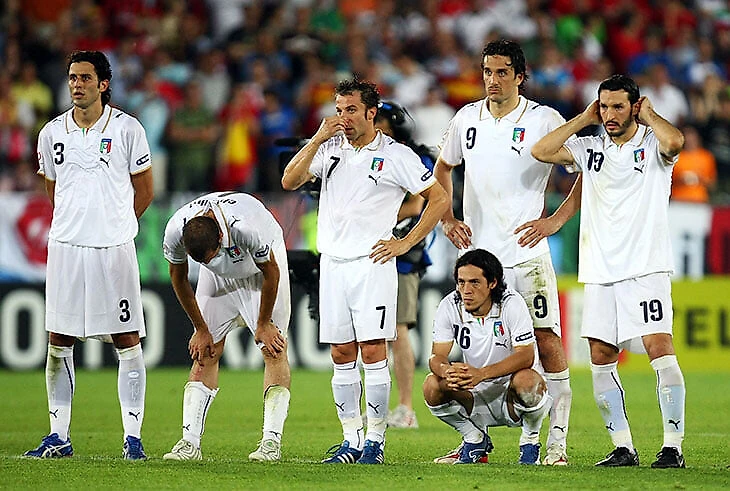 После победы на ЧМ-2006 идут сплошные разочарования: на Евро-2008 итальянцы вышли из группы и сразу проиграли той самой Испании, а после был провал на провале: на ЧМ-2010 и 2014 Италия не вышла из группы, на ЧМ-2018 вообще не попала и только на Евро как-то старалась соответствовать (в 2012-м добралась до финала, а в 2016-м уступила Германии в четвертьфинале).