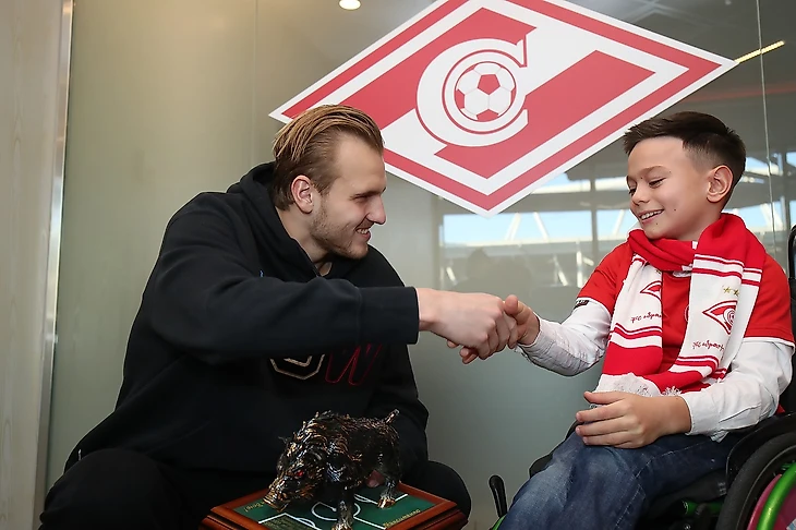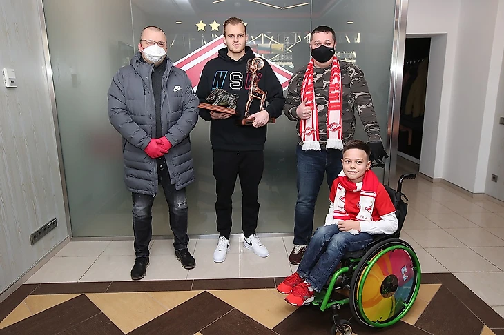 Наш вратарь получил призы из рук подопечного Фонда «Спартак — детям» Матвея Корябкина.