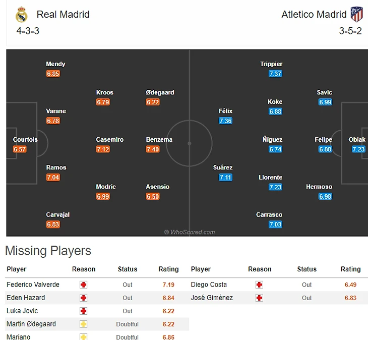 Темп – адский и наверняка Зидан постарается хоть как-то дозировать нагрузку лидеров (особенно учитывая, что сенаторы Мадрида уже совсем не юноши). Поэтому очередная травма Луки Йовича(8) – это вполне ощутимая потеря для сливочных, а возвращение в общую группу Дани Карвахаля(6,5) - очень приятный бонус.
