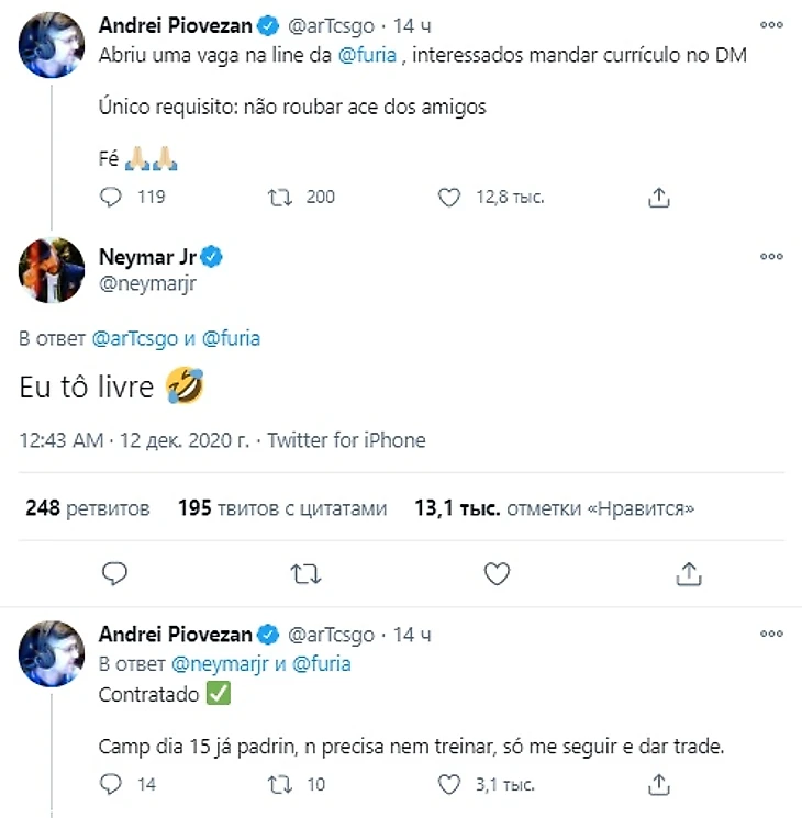 Защитник тогда написал: «Да, а Неймар все это время был в пузыре НБА». Неймар тогда ответил: «Да, они переманили меня».
