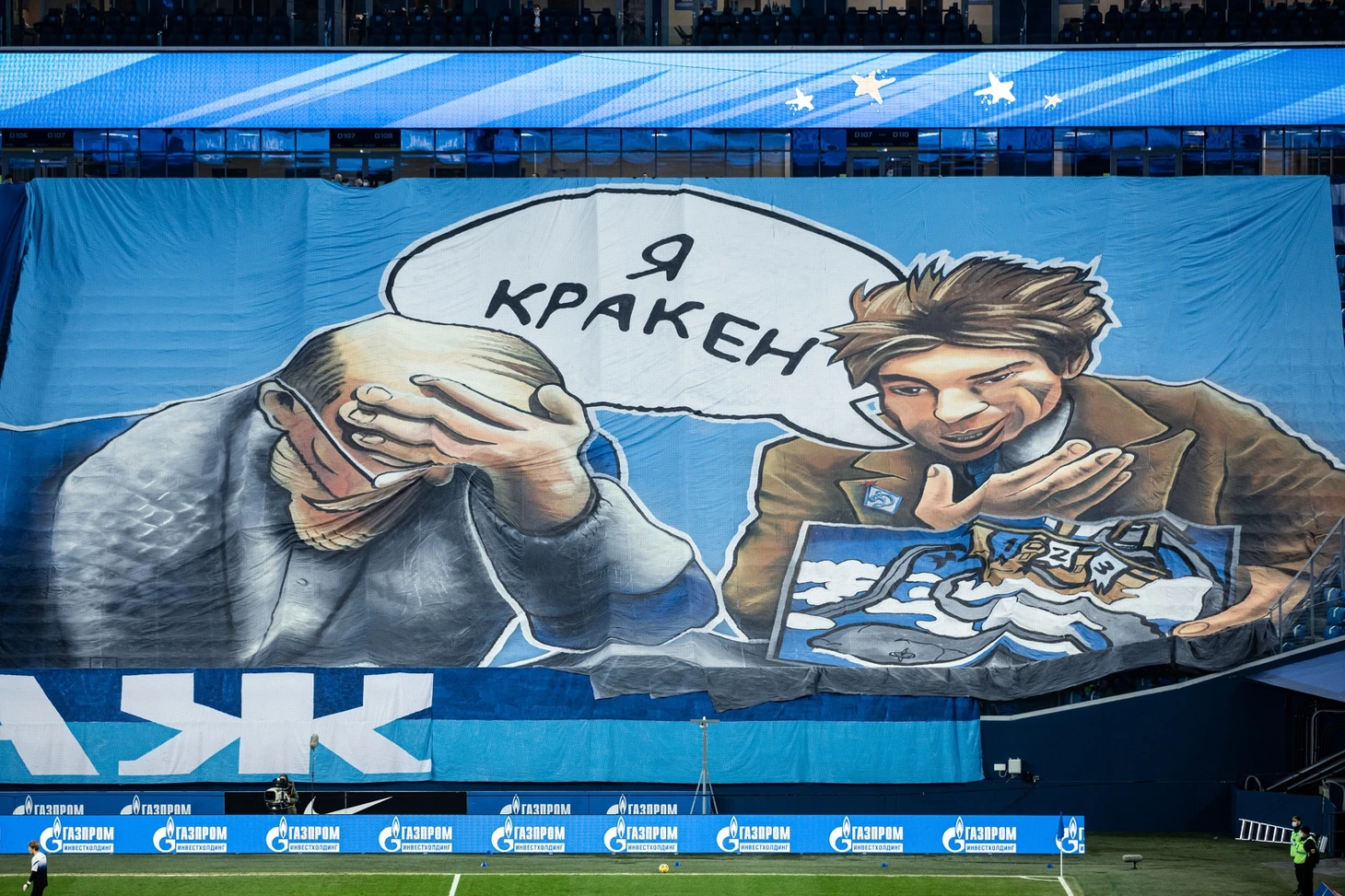 К сожалению, не все болельщики могли поддержать зенитовцев : из-за регламента матчи проходят без зрителей, либо на стадионе разрешается присутствие не более 2 тыс.человек ). Но несмотря на пустые трибуны, на фанатском секторе "Вираж" за час до матча появился масштабный баннер с героями повести Михаила Булгакова «Собачье сердце» — профессором Преображенским и Шариковым, на пиджаке которого пришит динамовский ромбик. Шариков при этом держит старый плакат сине-бело-голубых и говорит: «Я Кракен». Этот перфоманс был ответкой фанатом «Динамо», так как они делали баннер на котором морское чудовище нападает на корабль в сине-бело-голубых цветах.