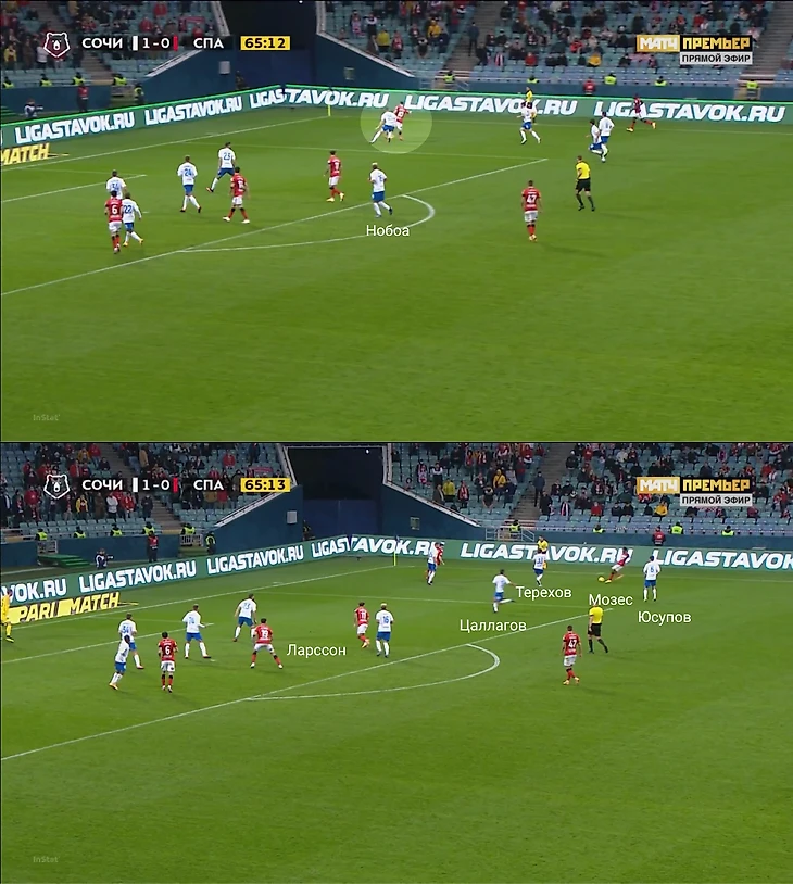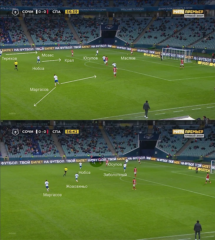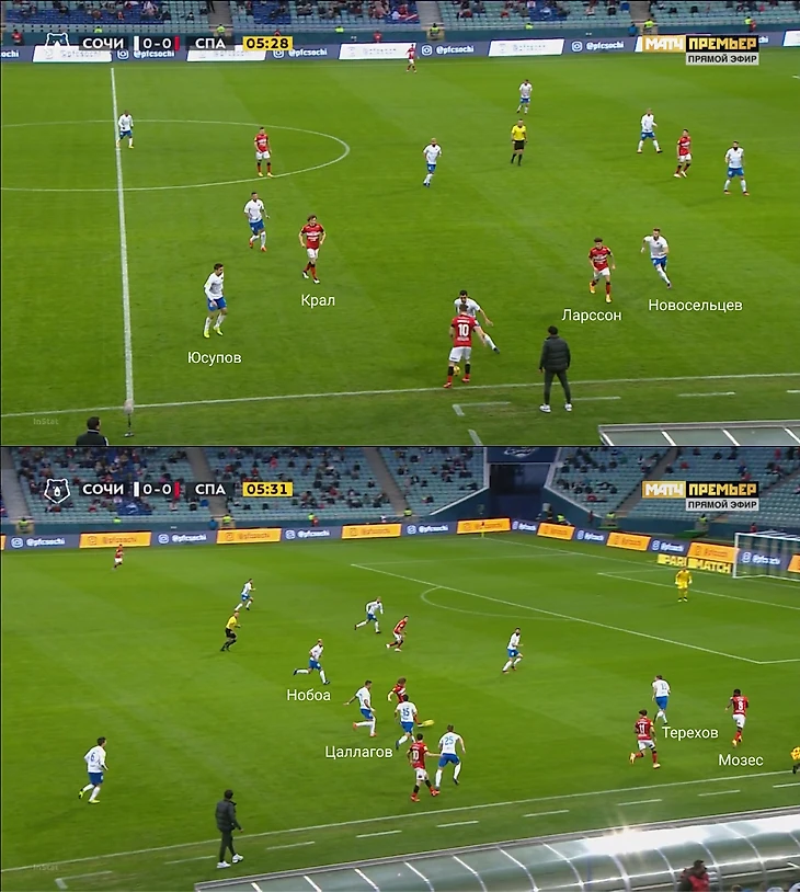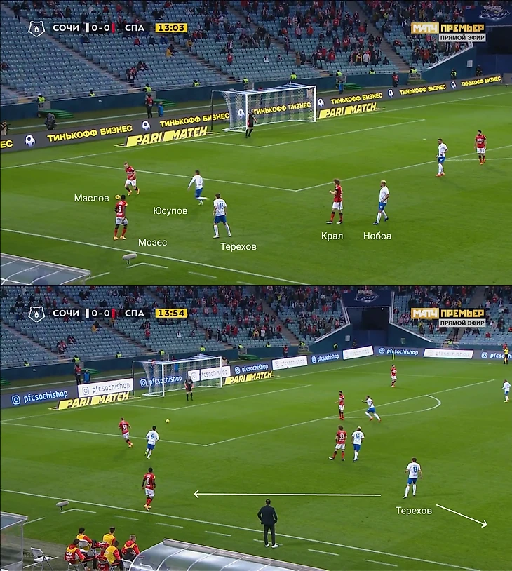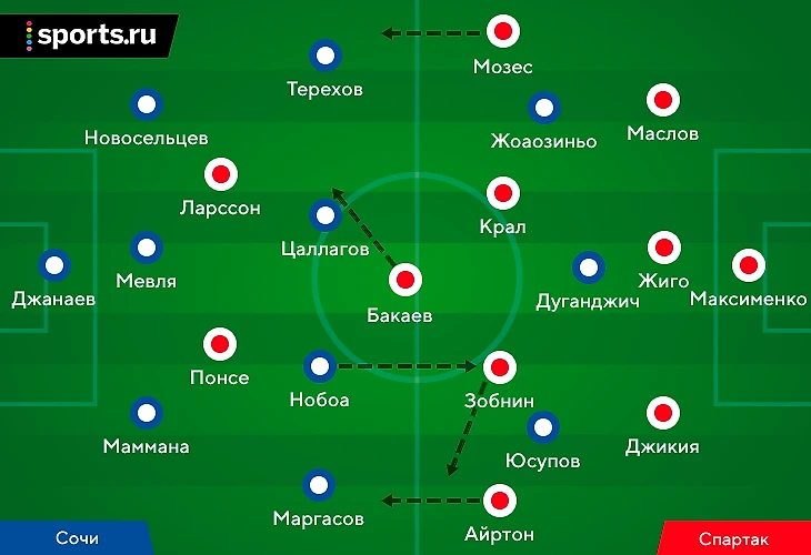Еще прессинг «Сочи» провоцировал попытки «Спартака» всей командой отойти назад для розыгрыша. В таких эпизодах «Спартак» суетился и терял мяч. Юсупов играл по Маслову, Терехов прибегал за Мозесом, а Нобоа персоналил Крала.