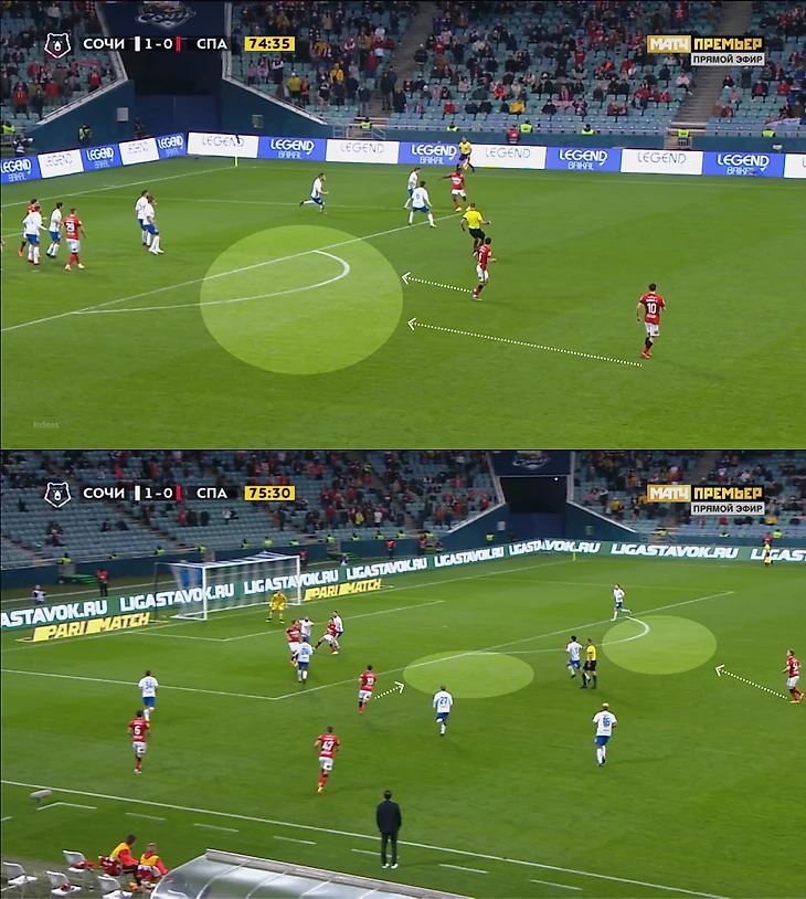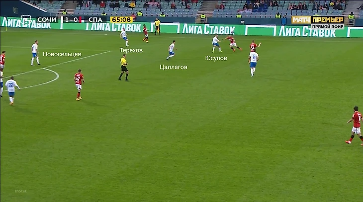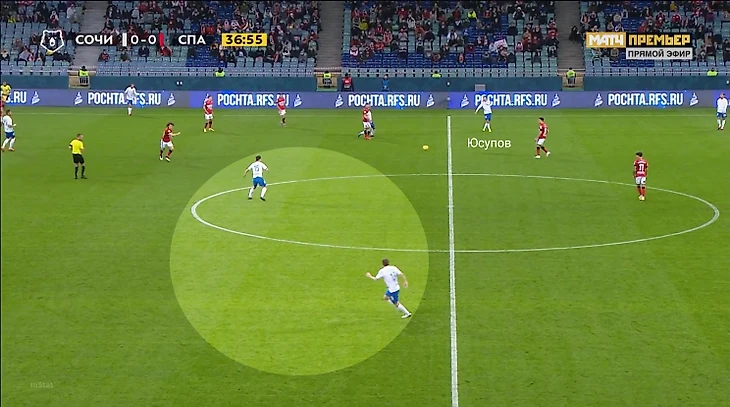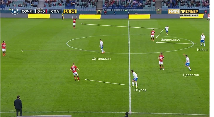 Суть прессинга «Сочи» проста: в большинстве случаев хозяева позволяли ЦЗ гостей разыгрывать мяч и встречали их около центрального круга – Дуганджич обозначал давление, Жоаозиньо и Юсупов чуть глубже контролировали фланги и потенциальные подключения в центр, а остальные персонально разбирали спартаковцев.