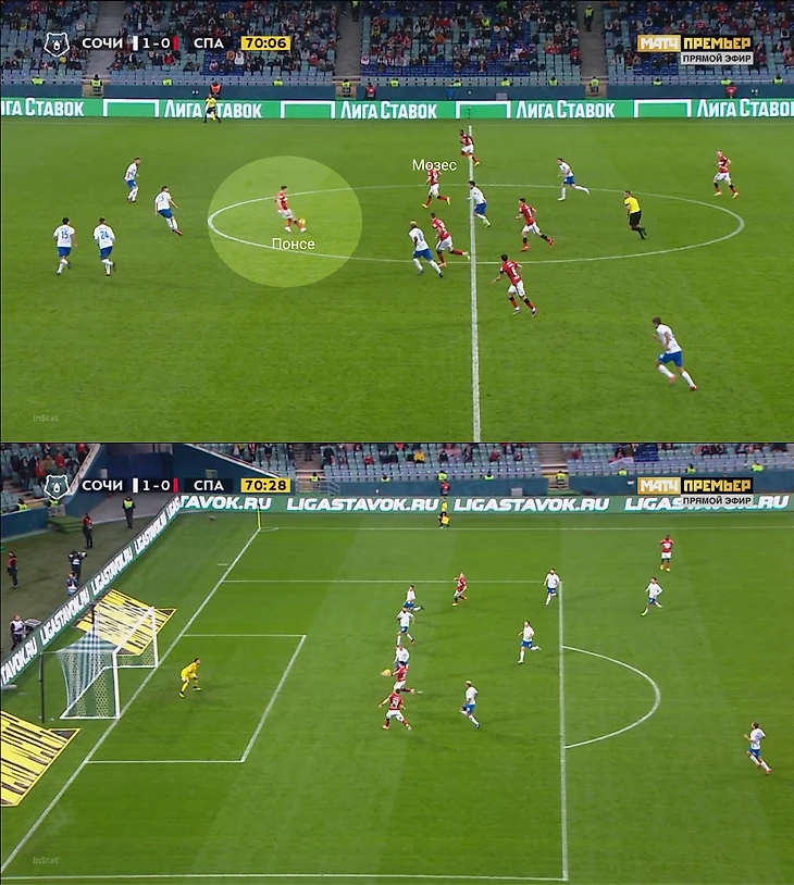 Например, супермомент Понсе вызван заполнением центральной зоны: он подобрал мяч и покатил на Мозеса, а затем шикарно открылся (хотя, возможно, стоило оставить мяч Кутепову).