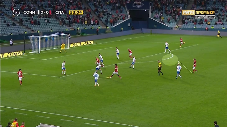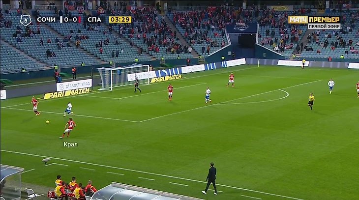 7. Не только слаженная игра «Сочи» заставила «Спартак» много навешивать. Фланговые котировки Крала, Зобнина и Бакаева лишили гостей вариантов в центре: все упиралось во фланги, а варианты переводов игнорировались, даже когда они были. «Спартак» слишком нацелился на игру краями.