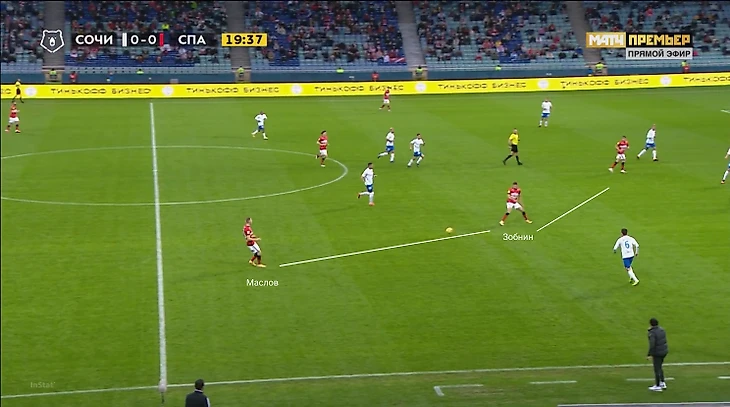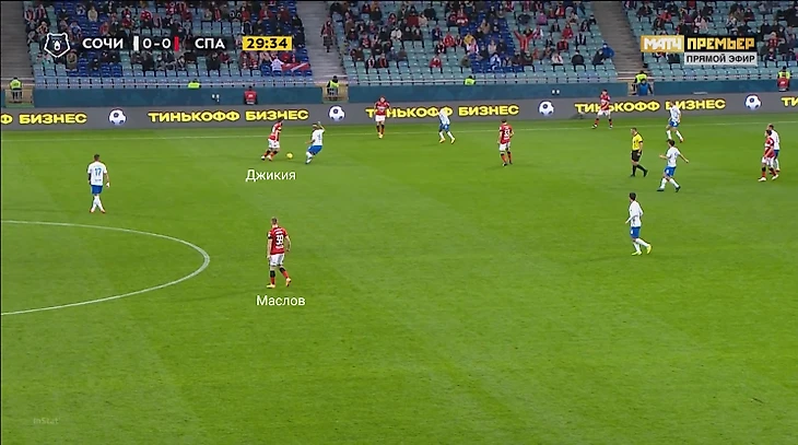 Слева была дополнительная опция – включения Джикии. В отличие от Маслова, он регулярно доходил до опорной зоны «Сочи». Павел поддерживал атаку иначе: он смещался по центру ближе к позиции Крала. Тут два умысла: так он становится дополнительным адресатом под контроль + есть возможность для моментального давления после потери.