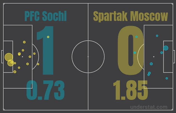 Статистика ожидаемых голов также подтверждает, что «Спартак» мог забивать, несмотря на отлично выстроенную игру «Сочи». По сути, количество голевых шансов одинаковое: 4 классных атаки «Сочи» + удар Нобоа против 4 отличных моментов «Спартака».