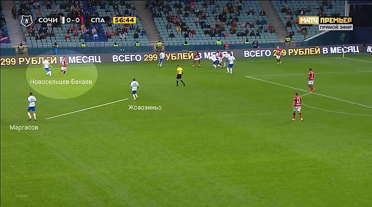 Важно, что остальная часть команды тоже поддержала движение: Новосельцев сыграл по Бакаеву – именно он перехватил мяч. Общее движение «Сочи» загнало «Спартак» во фланг.
