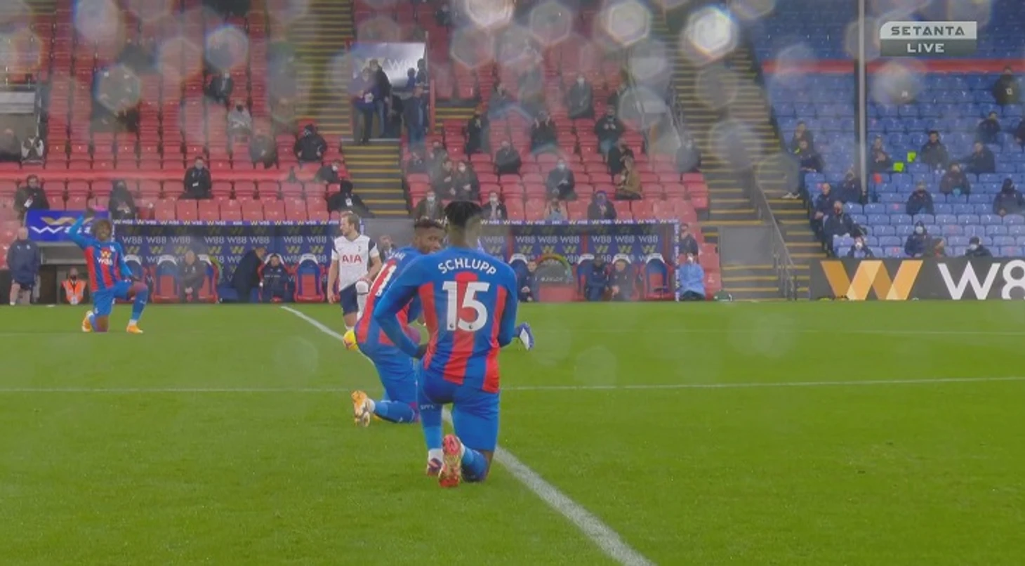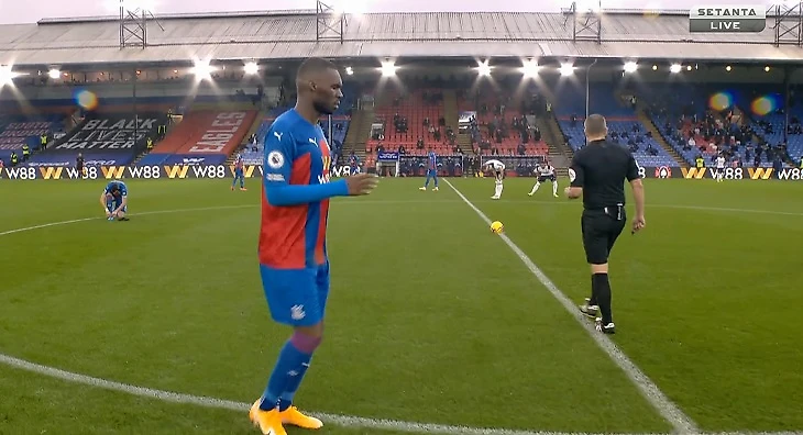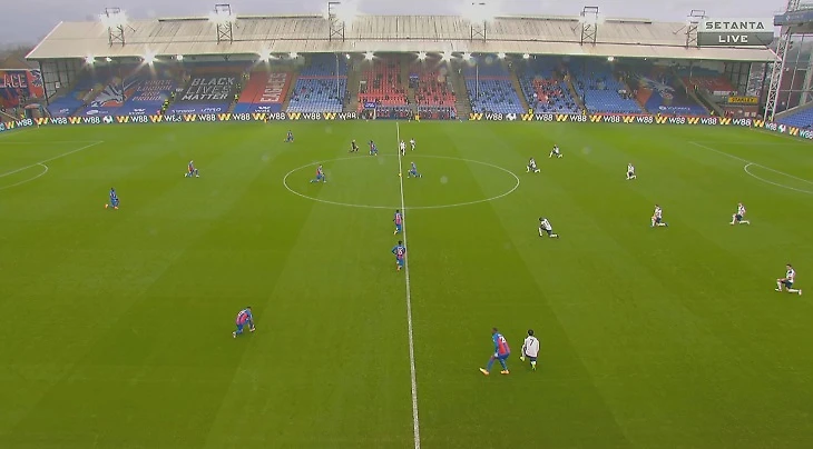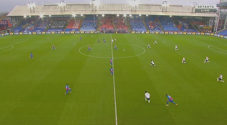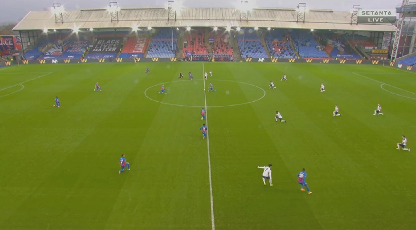 Кевин Френд дает свисток – но это не сигнал к старту: футболисты становятся на колено. В АПЛ так делают с лета – но Бентеке и Сон слишком увлеклись противостоянием.