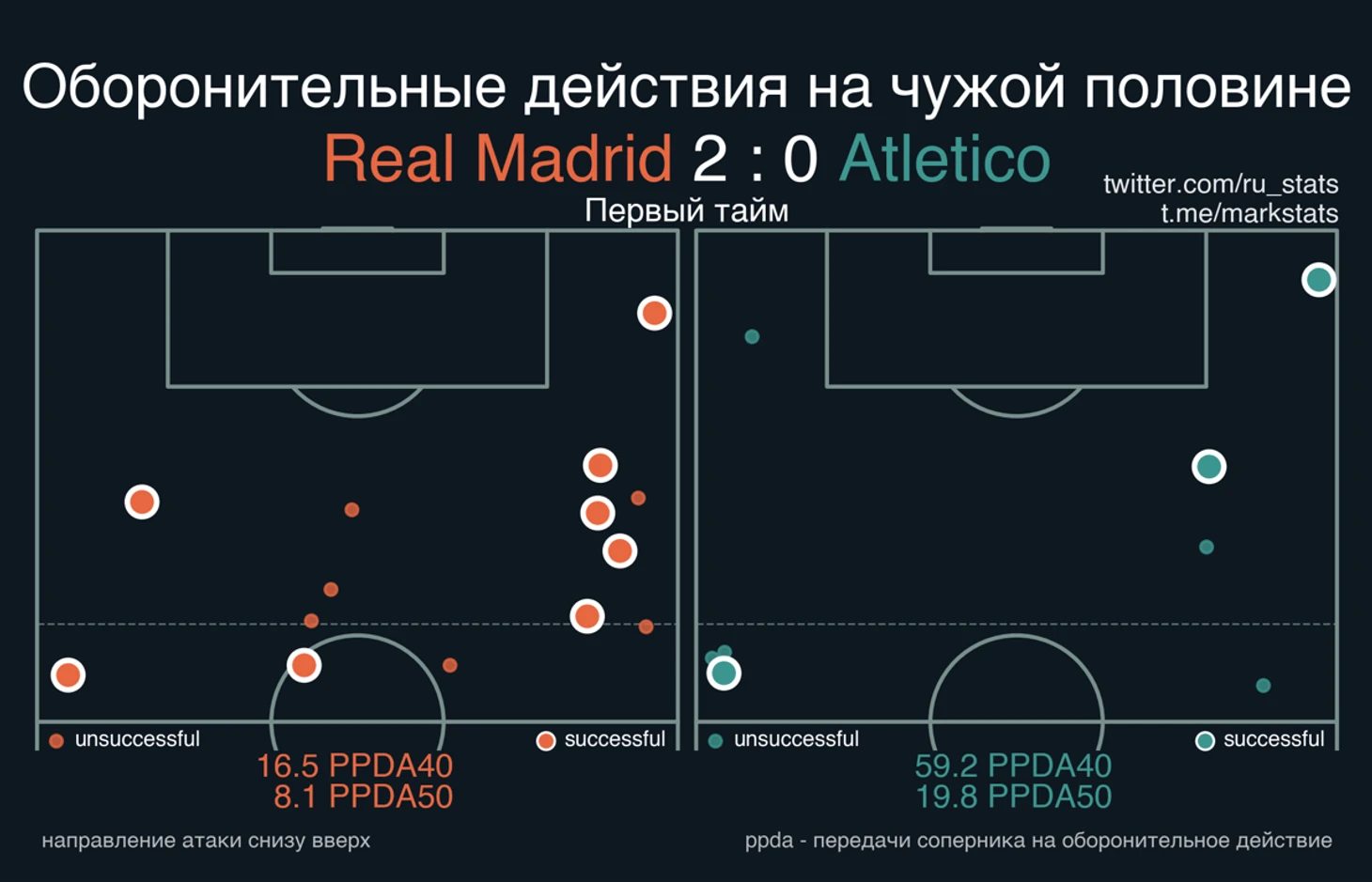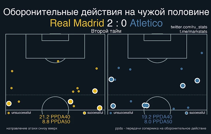 Самый печальный для команды Симеоне игровой аспект первого тайма – прессинг: трудно отыграться и перевернуть ход матча, когда в пределах 40 метров от ворот на одно оборонительное действие команды приходится более 50 передач соперника.