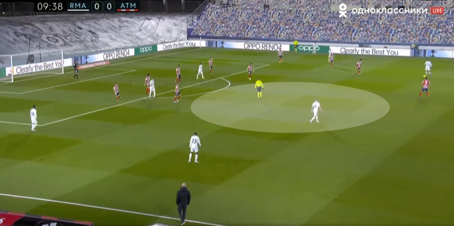 Всё дополняется некоторыми особенностями игроков: у «Атлетико» не было опорника типа Парти, который здорово и агрессивно закрывает прессинг-ловушки. Модрич и Кроос у «Реала» – специалисты по разрушению прессинга, их смещения вглубь, в том числе одновременные, очень важны для билдапа команды Зидана. Оба были доступны и отыграли почти весь матч, Кондогбиа же (оборонительный профиль схож с Парти) появился лишь в середине второго тайма.