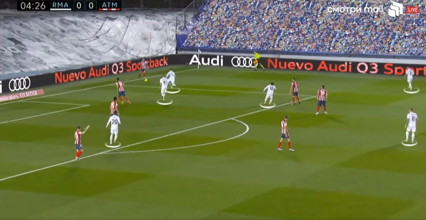 С Суаресом такого ждать по умолчанию вряд ли стоит – возраст и годы халтуры в обороне, в том числе и не по своей воле, дают о себе знать. Проблемы при обороне предугадывались: вряд ли Симеоне был заинтересован в том, чтобы большую часть матча отсиживаться в таком уязвимом низком блоке. Другое дело, что у «Реала» за весь матч был всего один явный голевой момент – Opta пометила так один из ударов Бензема в начале матча, хотя в большей степени на этот статус претендует гол Каземиро (возможно, снова уместно говорить об ошибке компании).