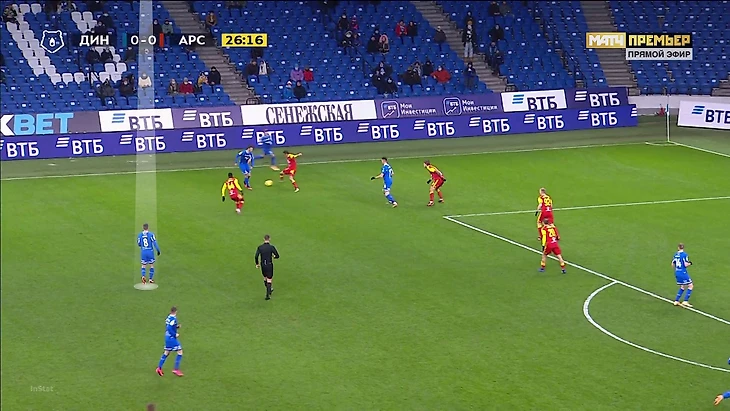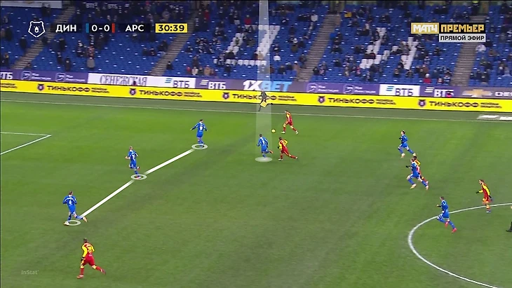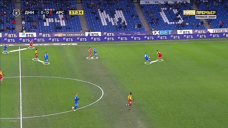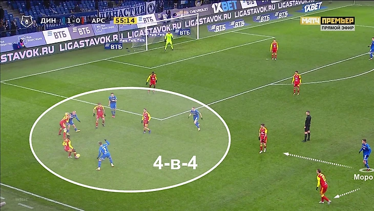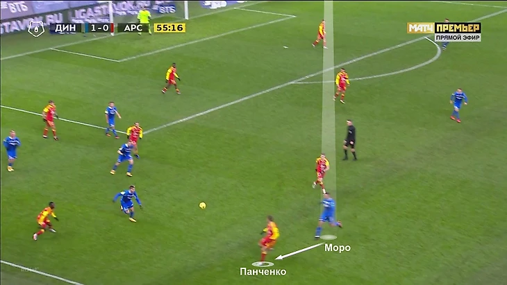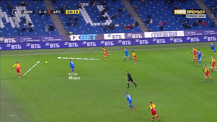Еще один впечатляющий эпизод при контрпрессинге: «Динамо» старается накрыть, но у «Арсенала» есть преимущество – как раз против Моро два оппонента: