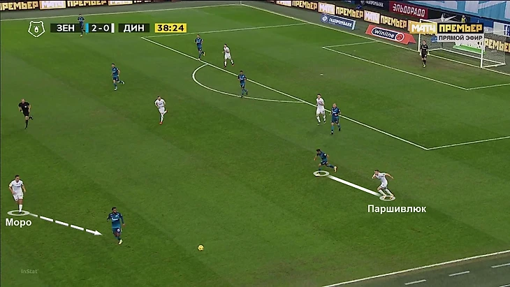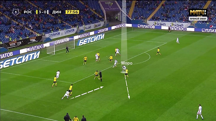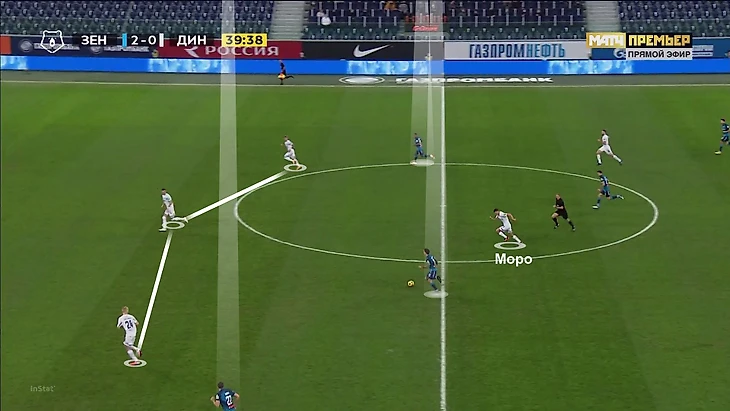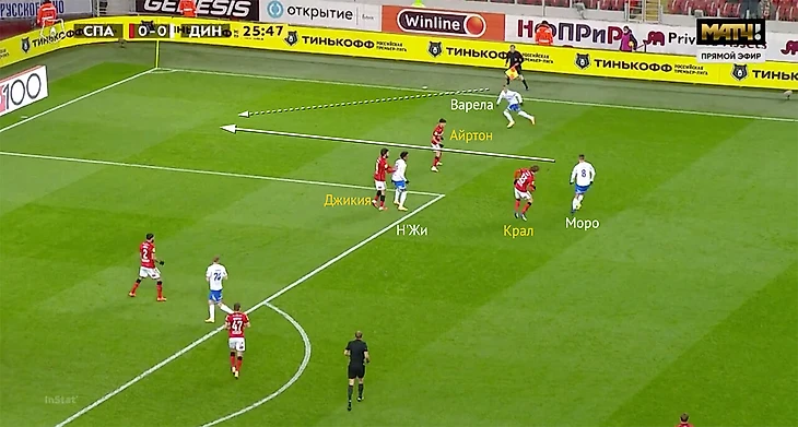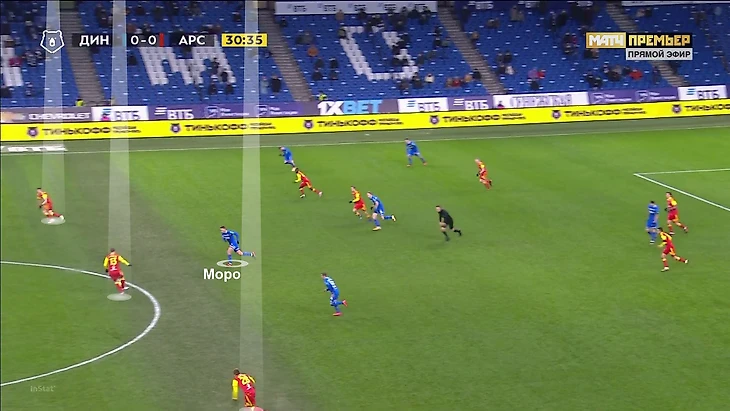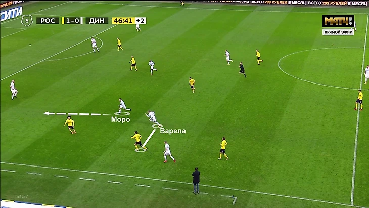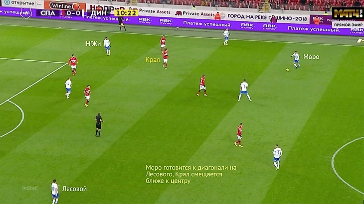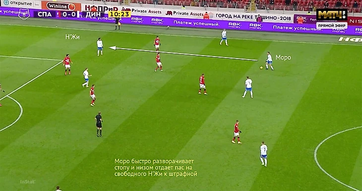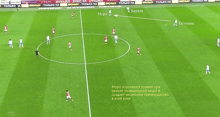 Моро же важен в первых стадиях атаки – особенно, когда «Динамо» владеет мячом и продвигается к чужой штрафной низом. Например, в первом тайме со «Спартаком» (1:1) «Динамо» часто строило атаки именно через правый полуфланг – там располагался Моро, рядом оказывался правый защитник Варела, а Н’Жи дергал защитников «Спартака» забеганиями за спину.