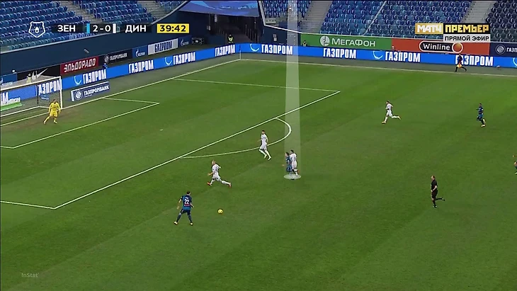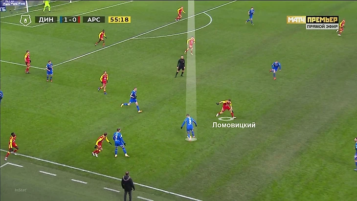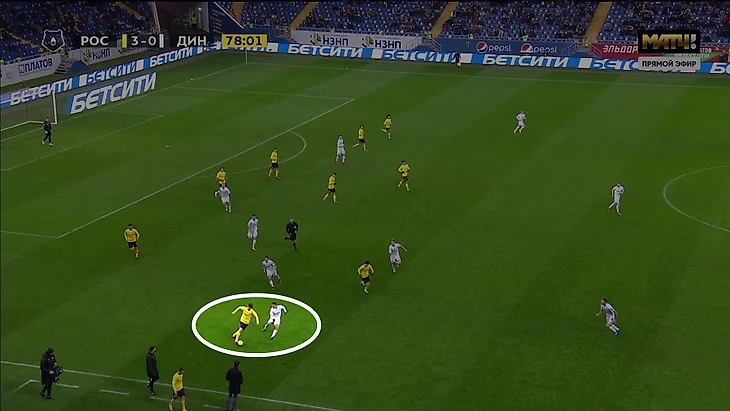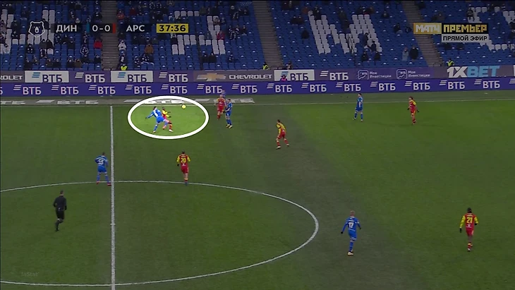 А здесь он организует контрпрессинг в одиночку (с его скоростью и такое возможно). «Динамо» в плохих позициях на момент потери: